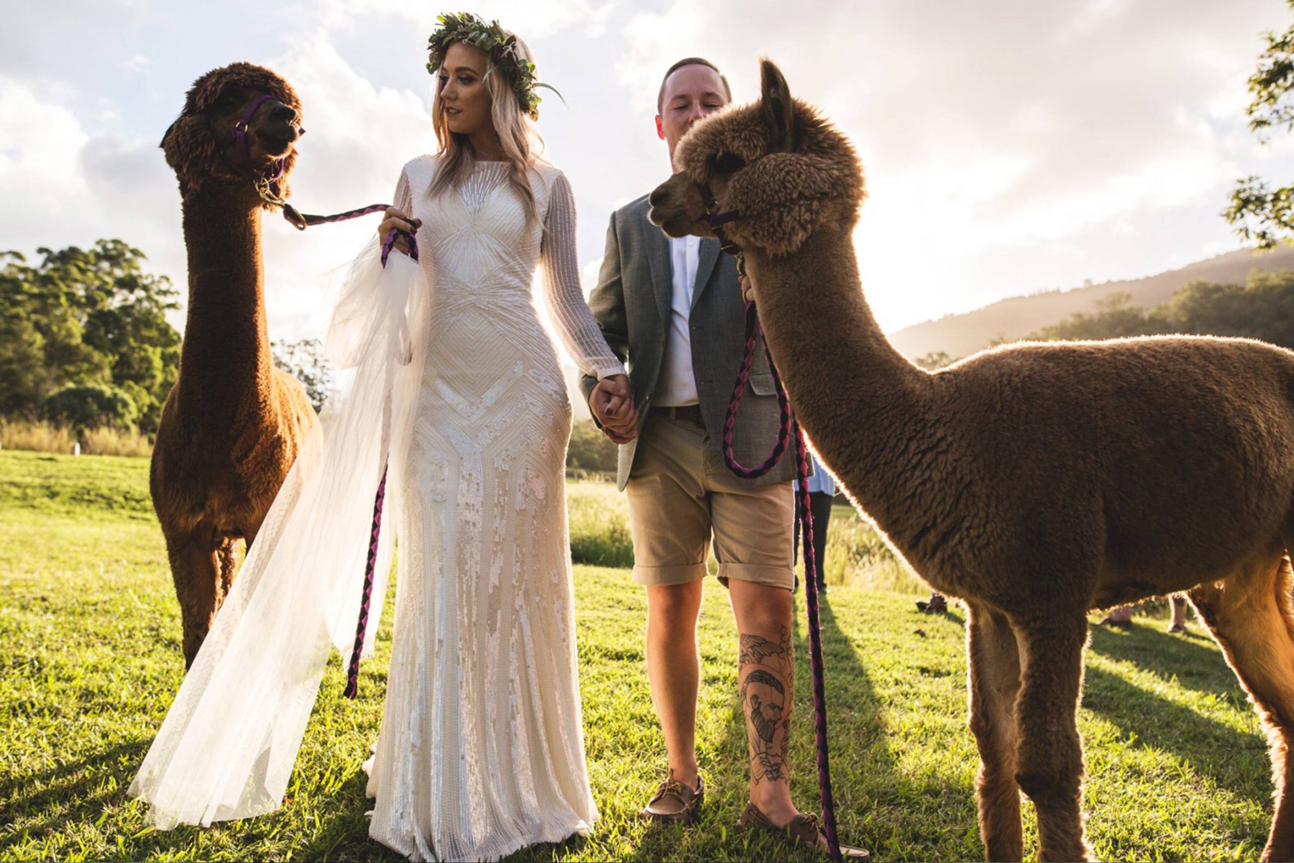 No wedding will ever be the same as Lauren and Luke’s was at the Gold Coast Farm House, complete with Llama’s for guests to pat. This Gold Coast wedding venue has plenty of room to set up your dream wedding, bring your pets and even have a game of crochet. Lauren wanted to DIY as much of her wedding as possible. She made her own floral arrangements for her arbor, bridesmaids and herself. Instead of buying a wedding cake she instead opted for donuts, simple, cheap and easy but delicious all the same.